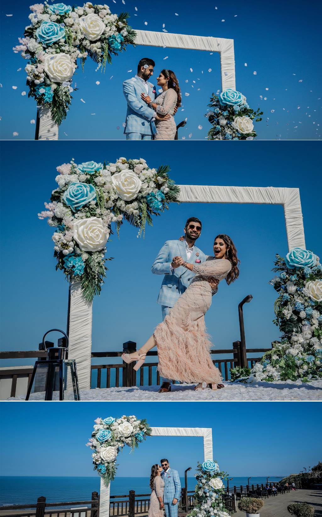 The rain on the Mehendi night turned the climate even more beautiful. The color palette for the event perfectly matched the clear blue skies of Azerbaijan while the large floral elements added a rustic romance to the decor. For her engagement ceremony, Barkha picked up a shimmering silver dress while Manish, on the other hand, wore a light blue blazer and pants with a white shirt to match the event decor palette.  The couple entry with the cute kids stole the show.